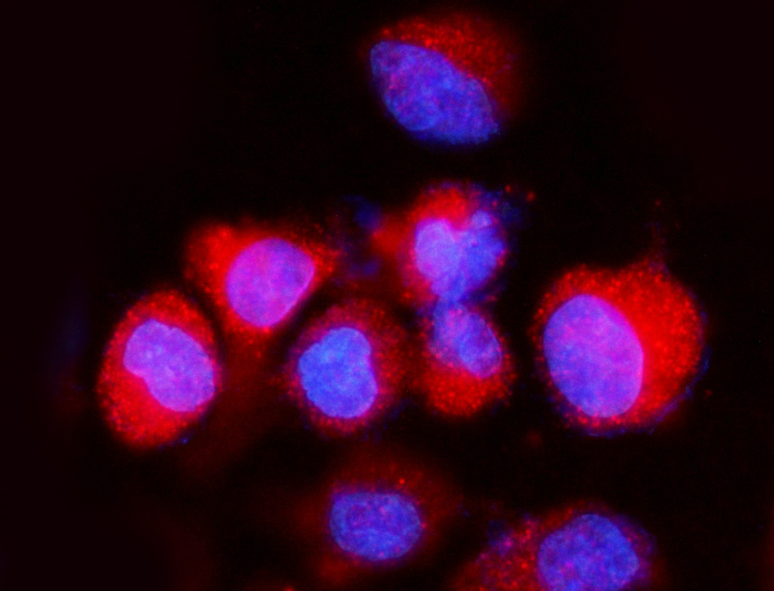 ATP6V1A was detected in an immunocytochemical section of A549 cells. The section was incubated with rabbit anti-ATP6V1A Antibody (A10401-2) at a dilution of 1:100. Fluoro594-conjugated Anti-rabbit IgG Secondary Antibody (red)(Catalog#BA1142) was used as secondary antibody. The section was counterstained with DAPI (Catalog # AR1176) (Blue).