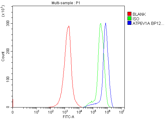 Overlay histogram showing Jurkat cells stained with A10401-2 (Blue line). To facilitate intracellular staining, cells were fixed with 4% paraformaldehyde and permeabilized with permeabilization buffer. The cells were blocked with 10% normal goat serum. And then incubated with rabbit anti-ATP6V1A Antibody (A10401-2) at 1:100 dilution for 30 min at 20°C. Fluoro488 conjugated goat anti-rabbit IgG (BA1127) was used as secondary antibody at 1:100 dilution for 30 minutes at 20°C. Isotype control antibody (Green line) was rabbit IgG at 1:100 dilution used under the same conditions. Unlabelled sample without incubation with primary antibody and secondary antibody (Red line) was used as a blank control.