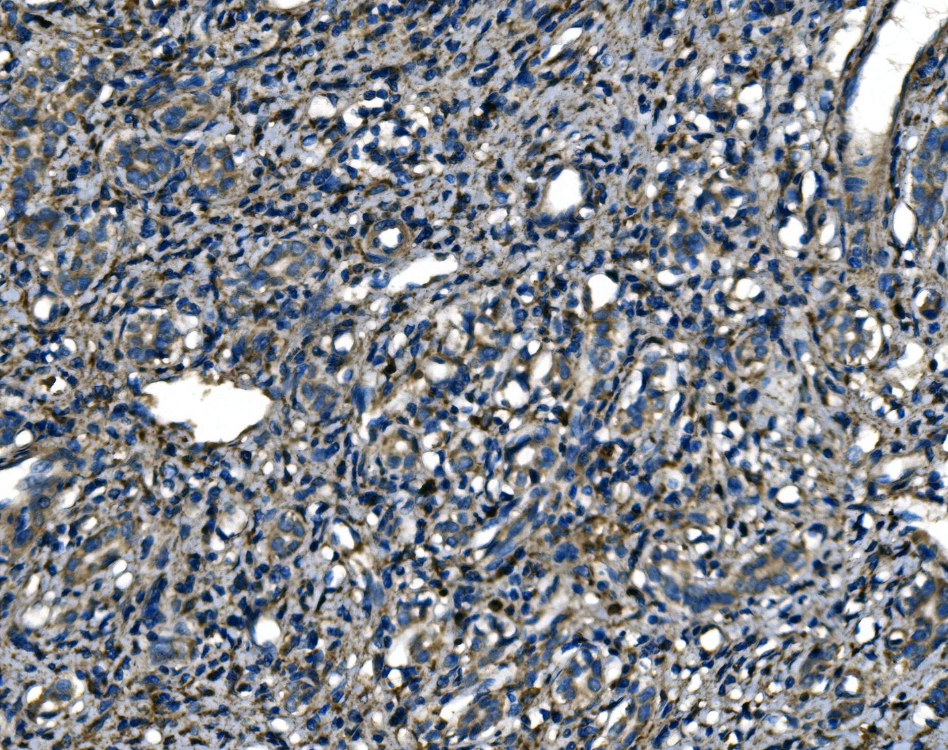 ATP6V1A was detected in a paraffin-embedded section of human cervical cancer tissue. The tissue section was incubated with rabbit anti-ATP6V1A Antibody (A10401-2) at a dilution of 1:200 and developed using HRP Conjugated Rabbit IgG Super Vision Assay Kit (Catalog # SV0002) with DAB (Catalog # AR1027) as the chromogen.