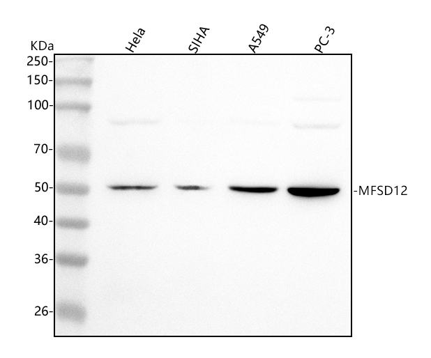 Western blot analysis of anti-MFSD12 antibody (A16855-1). The sample well of each lane was loaded with 30 ug of sample under reducing conditions.