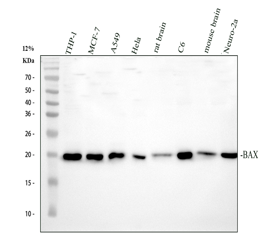 Western blot analysis of BAX using anti-BAX antibody (BA0315-2). The sample well of each lane was loaded with 30 ug of sample under reducing conditions.