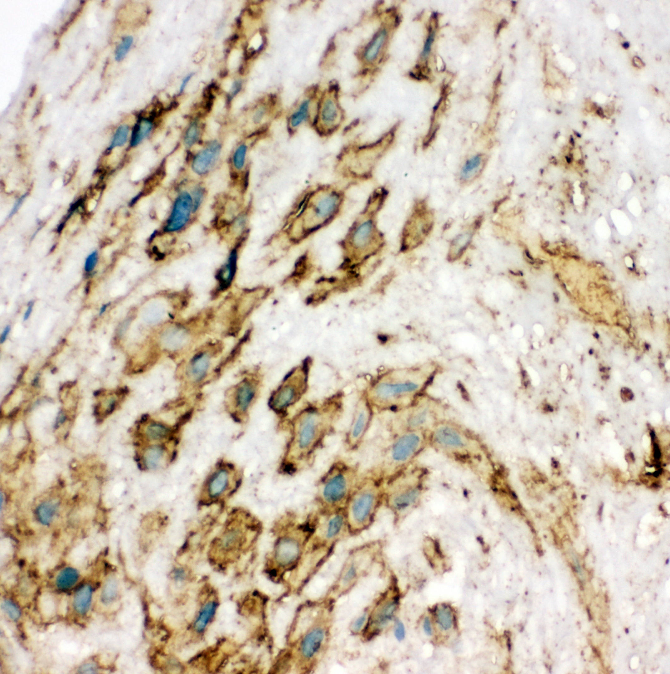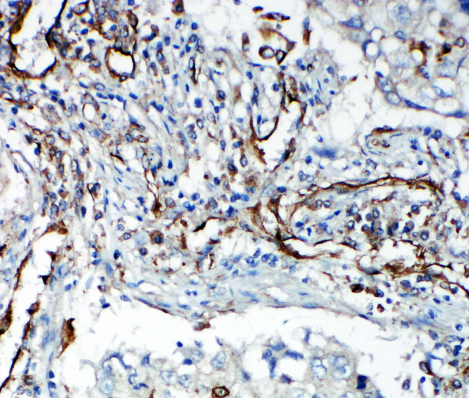 VEGFR2/KDR was detected in a paraffin-embedded section of human lung cancer tissue. The tissue section was incubated with rabbit anti-VEGFR2/KDR Antibody (BA0472) at a dilution of 1:200 and developed using HRP Conjugated Rabbit IgG Super Vision Assay Kit (Catalog # SV0002) with DAB (Catalog # AR1027) as the chromogen.