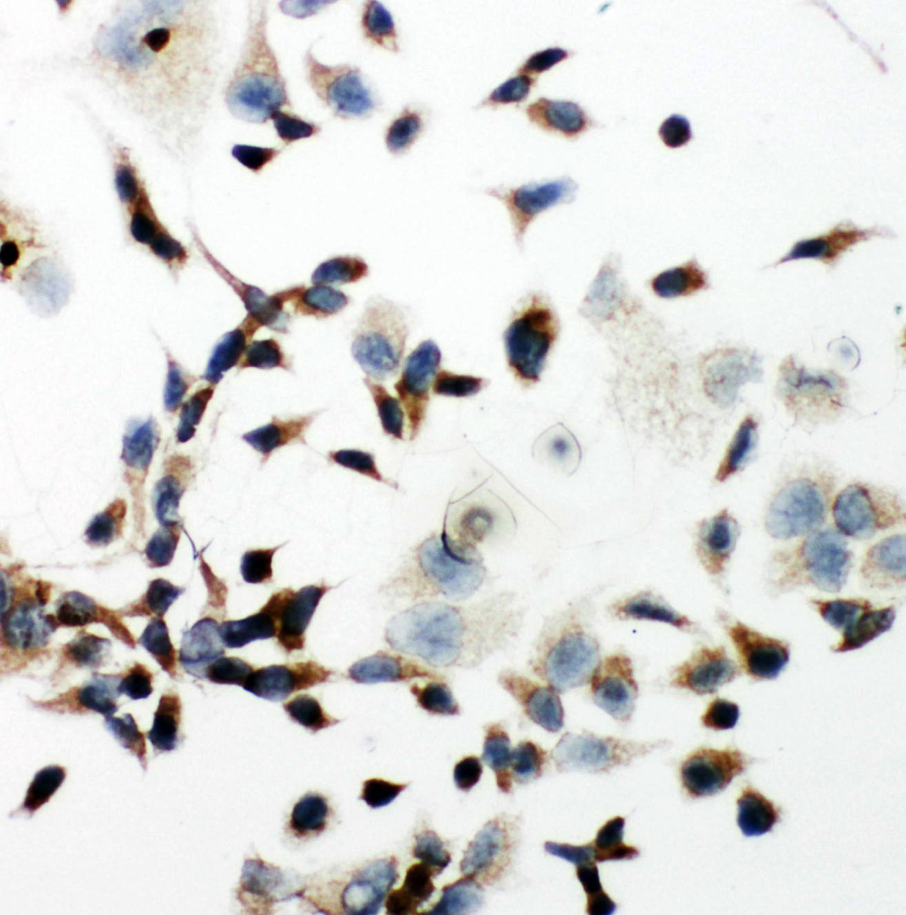 VEGFR2/KDR was detected in an immunocytochemical section of Hela cells. The section was incubated with rabbit anti-VEGFR2/KDR Antibody (BA0472) at a dilution of 1:100. Biotinylated goat anti-rabbit IgG was used as secondary antibody. The section was developed using Strepavidin-Biotin-Complex (SABC)(Catalog # SA1022) with DAB (Catalog # AR1027) as the chromogen.