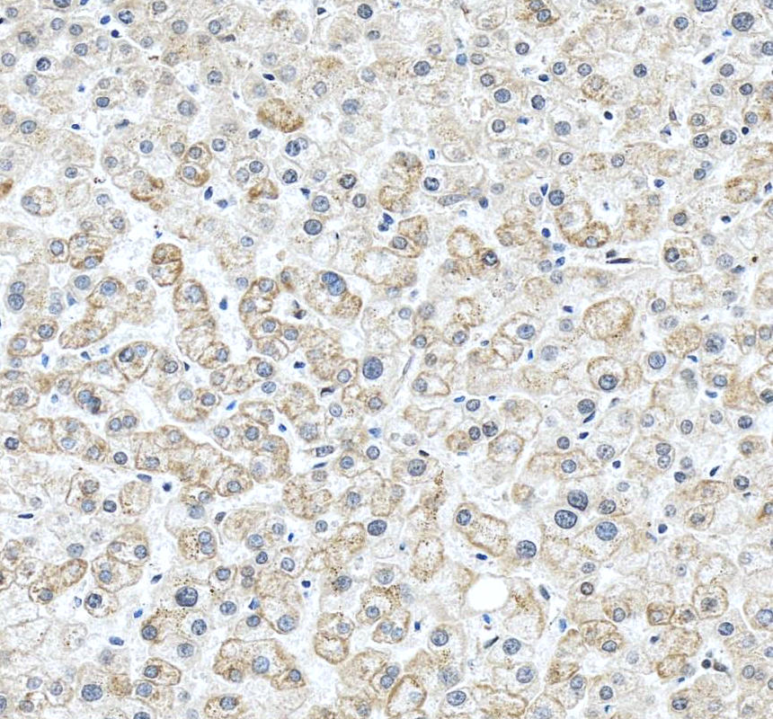 Cytochrome c/CYCS was detected in a paraffin-embedded section of human liver tissue. The tissue section was incubated with rabbit anti-Cytochrome c/CYCS Antibody (BA0781) at a dilution of 1:200 and developed using HRP Conjugated Rabbit IgG Super Vision Assay Kit (Catalog # SV0002) with DAB (Catalog # AR1027) as the chromogen.