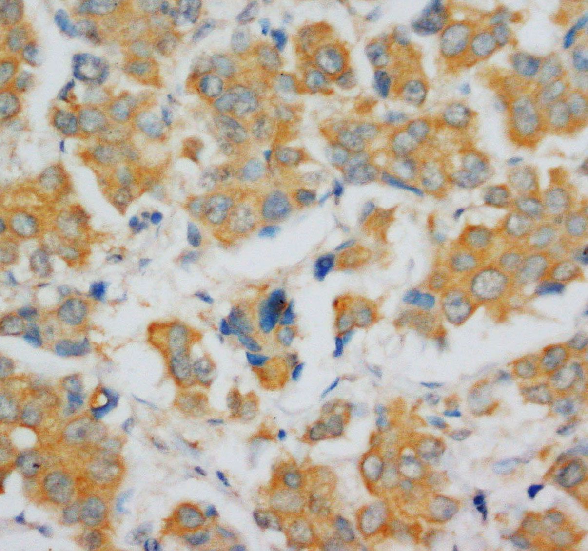 FGF4 was detected in a paraffin-embedded section of human breast cancer tissue. Biotinylated goat anti-rabbit IgG was used as secondary antibody. The tissue section was incubated with rabbit anti-FGF4 Antibody (BA0848-1) at a dilution of 1:200 and developed using Strepavidin-Biotin-Complex (SABC) (Catalog # SA1022) with DAB (Catalog # AR1027) as the chromogen.