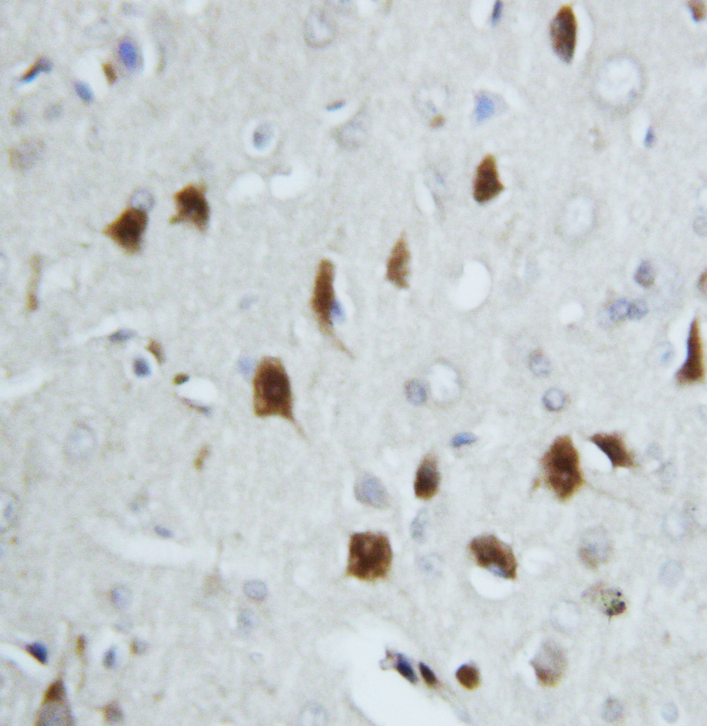 HSP70 was detected in a paraffin-embedded section of rat brain tissue. Biotinylated goat anti-rabbit IgG was used as secondary antibody. The tissue section was incubated with rabbit anti-HSP70 Antibody (BA0928) at a dilution of 1:200 and developed using Strepavidin-Biotin-Complex (SABC) (Catalog # SA1022) with DAB (Catalog # AR1027) as the chromogen.