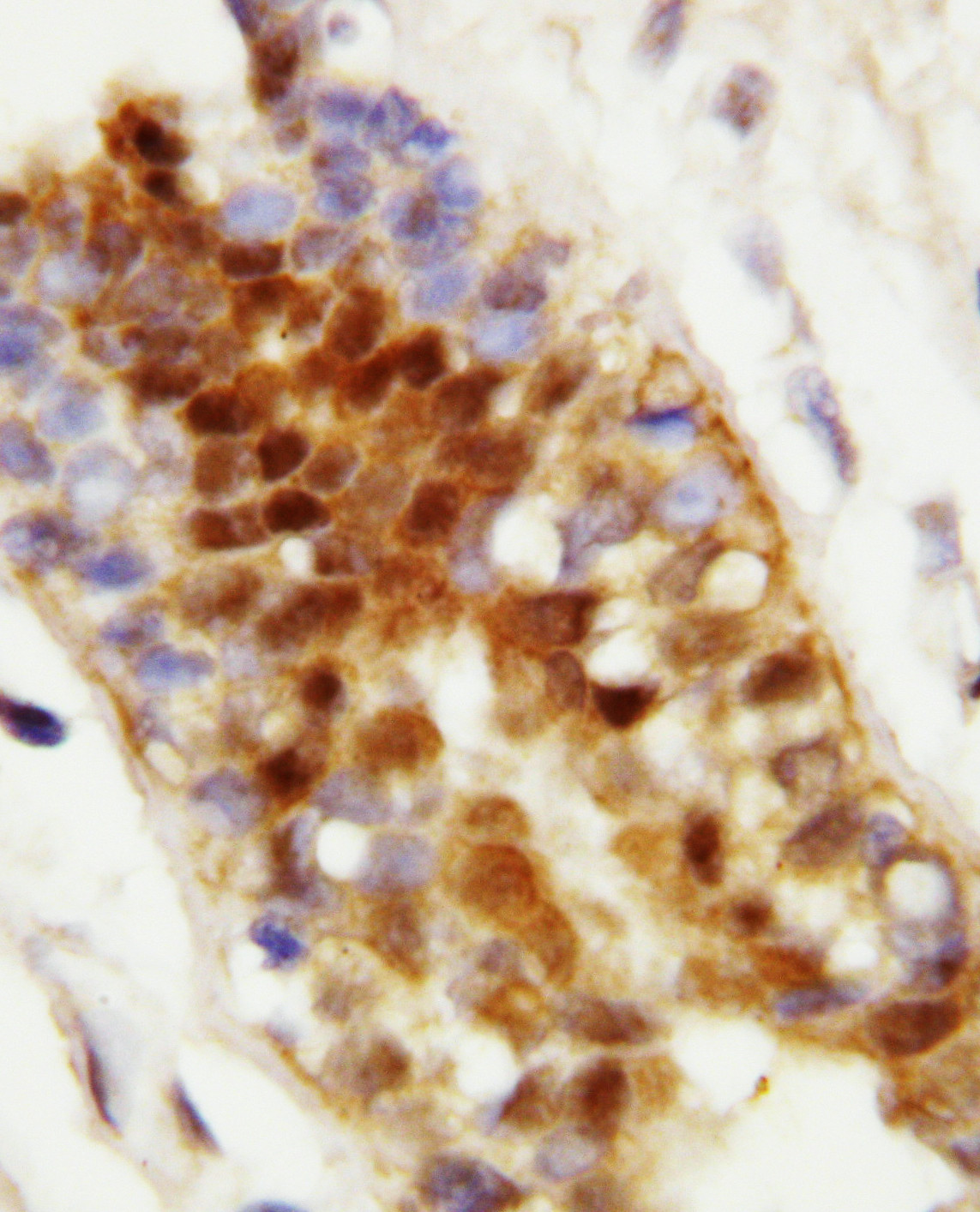 HSP70 was detected in a paraffin-embedded section of mammary cancer tissue. Biotinylated goat anti-rabbit IgG was used as secondary antibody. The tissue section was incubated with rabbit anti-HSP70 Antibody (BA0928) at a dilution of 1:200 and developed using Strepavidin-Biotin-Complex (SABC) (Catalog # SA1022) with DAB (Catalog # AR1027) as the chromogen.