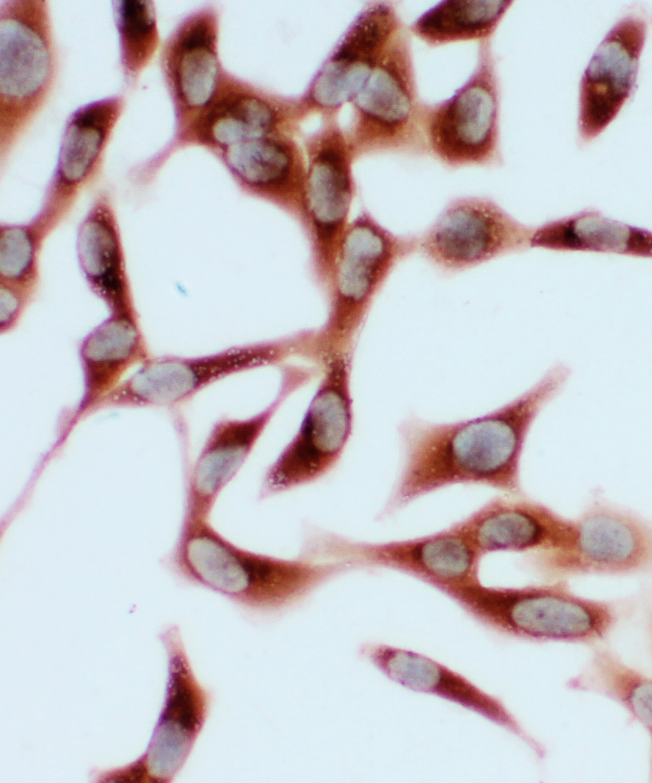 HSP70 was detected in an immunocytochemical section of Hela cells. The section was incubated with rabbit anti-HSP70 Antibody (BA0928) at a dilution of 1:100. Biotinylated goat anti-rabbit IgG was used as secondary antibody. The section was developed using Strepavidin-Biotin-Complex (SABC)(Catalog # SA1022) with DAB (Catalog # AR1027) as the chromogen.