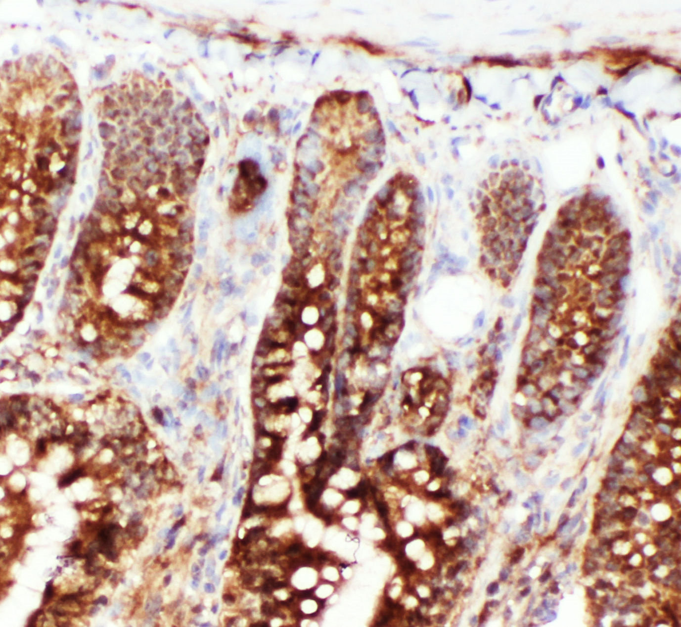 HSP70 was detected in frozen section of rat intestine tissue. Biotinylated goat anti-rabbit IgG was used as secondary antibody. The tissue section was incubated with rabbit anti-HSP70 Antibody (BA0928) at a dilution of 1:200 and developed using Strepavidin-Biotin-Complex (SABC) (Catalog # SA1022) with DAB (Catalog # AR1027) as the chromogen.