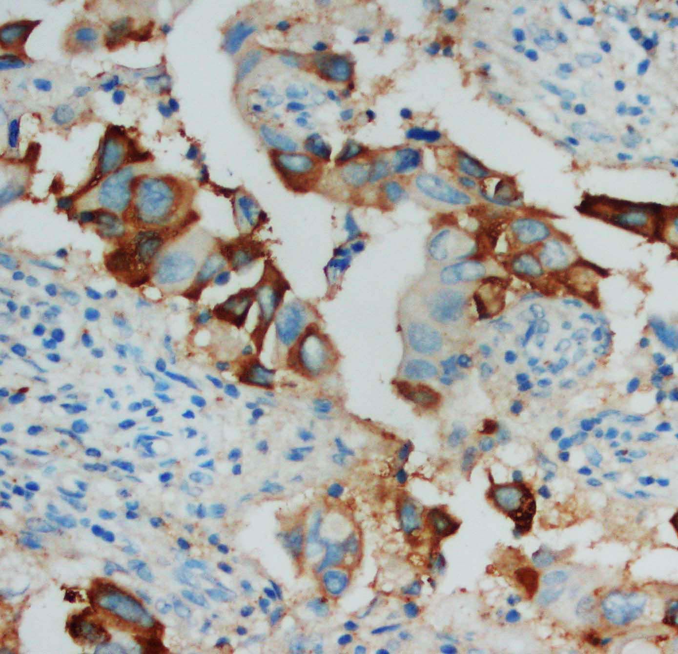 IL2 was detected in a paraffin-embedded section of human breast cancer tissue. Biotinylated goat anti-rabbit IgG was used as secondary antibody. The tissue section was incubated with rabbit anti-IL2 Antibody (BA1644-1) at a dilution of 1:200 and developed using Strepavidin-Biotin-Complex (SABC) (Catalog # SA1022) with DAB (Catalog # AR1027) as the chromogen.