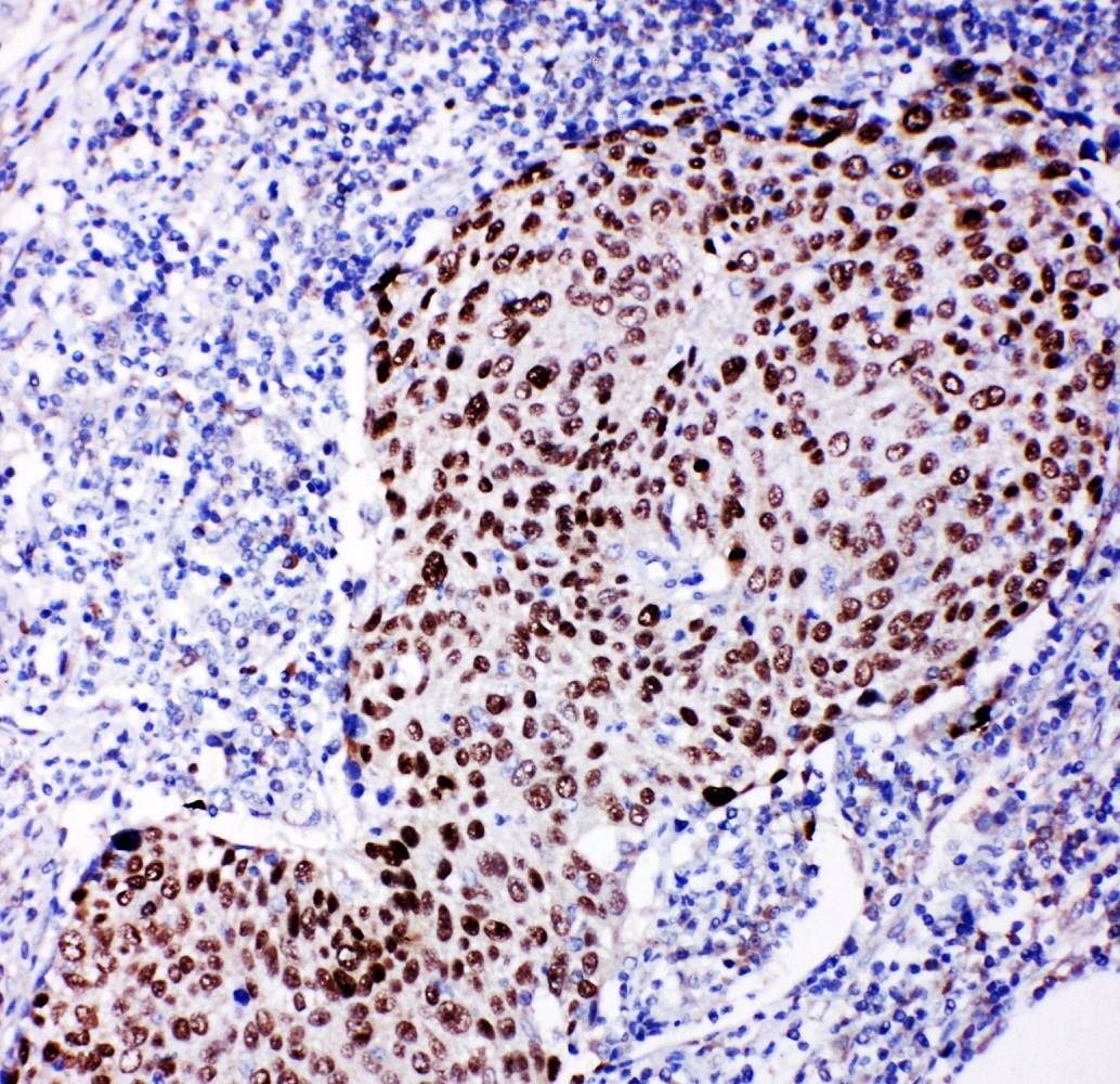 p63/TP63 was detected in a paraffin-embedded section of human lung cancer tissue. Biotinylated goat anti-rabbit IgG was used as secondary antibody. The tissue section was incubated with rabbit anti-p63/TP63 Antibody (BA1887) at a dilution of 1:200 and developed using Strepavidin-Biotin-Complex (SABC) (Catalog # SA1022) with DAB (Catalog # AR1027) as the chromogen.