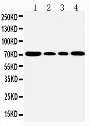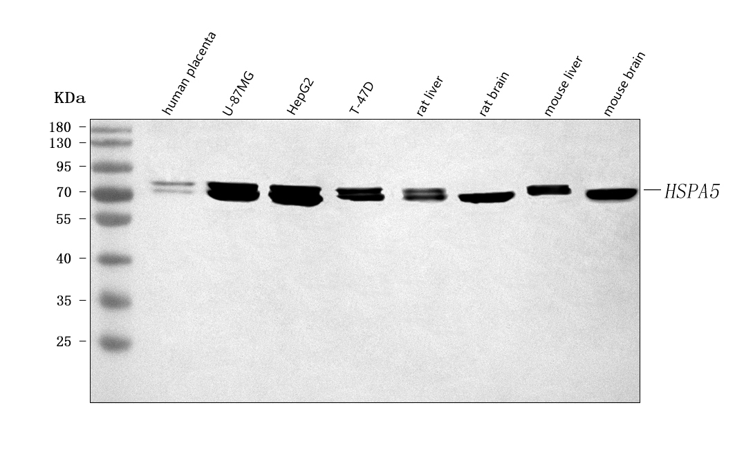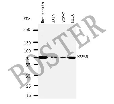 Western blot analysis of GRP78/BIP/HSPA5 using anti-GRP78/BIP/HSPA5 antibody (BA2042). The sample well of each lane was loaded with 30 ug of sample under reducing conditions.