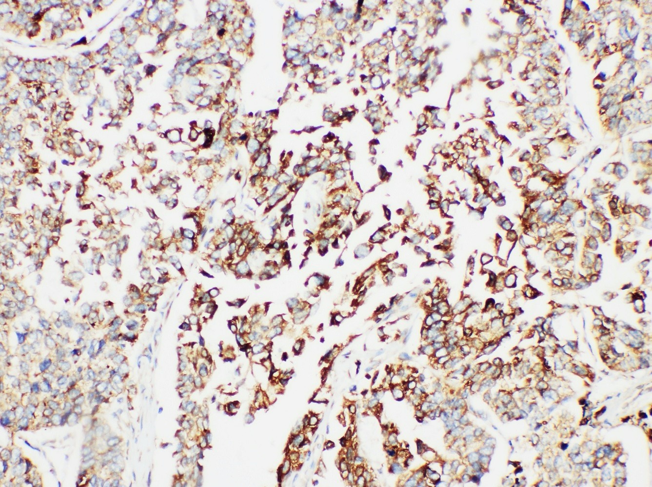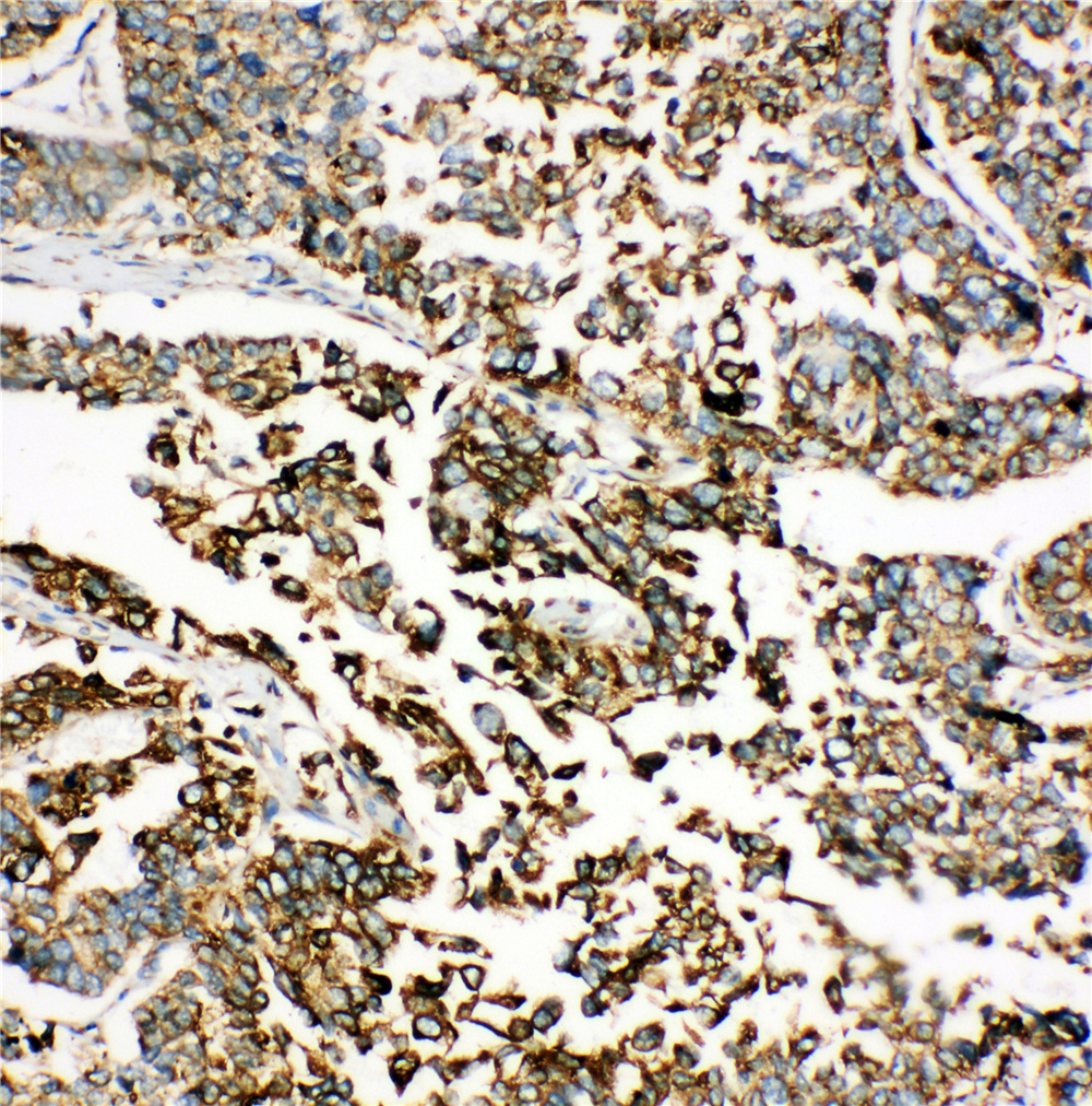 GRP78/BIP/HSPA5 was detected in a paraffin-embedded section of human lung cancer tissue. The tissue section was incubated with rabbit anti-GRP78/BIP/HSPA5 Antibody (BA2042) at a dilution of 1:200 and developed using HRP Conjugated Rabbit IgG Super Vision Assay Kit (Catalog # SV0002) with DAB (Catalog # AR1027) as the chromogen.