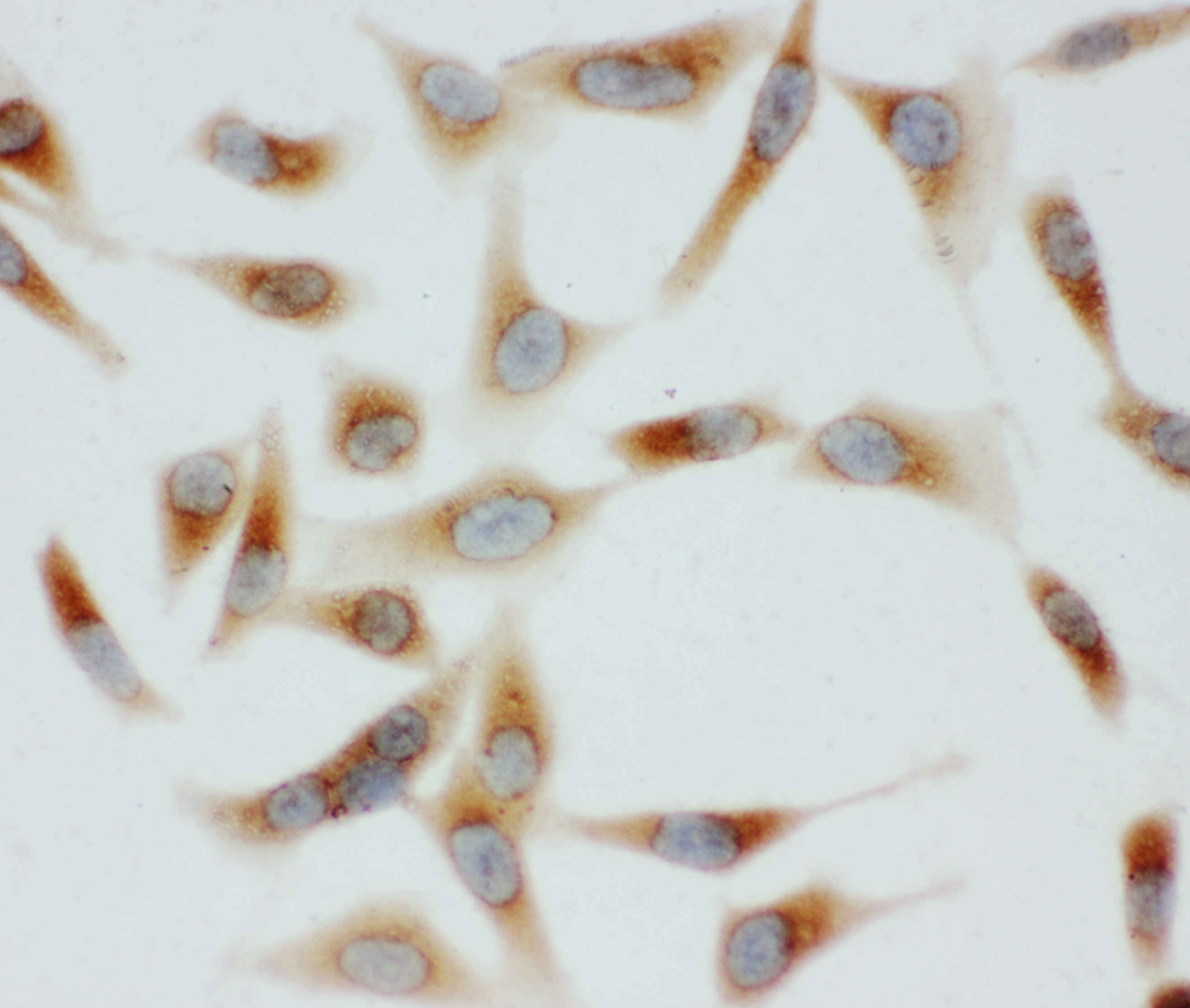 GRP78/BIP/HSPA5 was detected in an immunocytochemical section of Hela cells. The section was incubated with rabbit anti-GRP78/BIP/HSPA5 Antibody (BA2042) at a dilution of 1:100. Biotinylated goat anti-rabbit IgG was used as secondary antibody. The section was developed using Strepavidin-Biotin-Complex (SABC)(Catalog # SA1022) with DAB (Catalog # AR1027) as the chromogen.