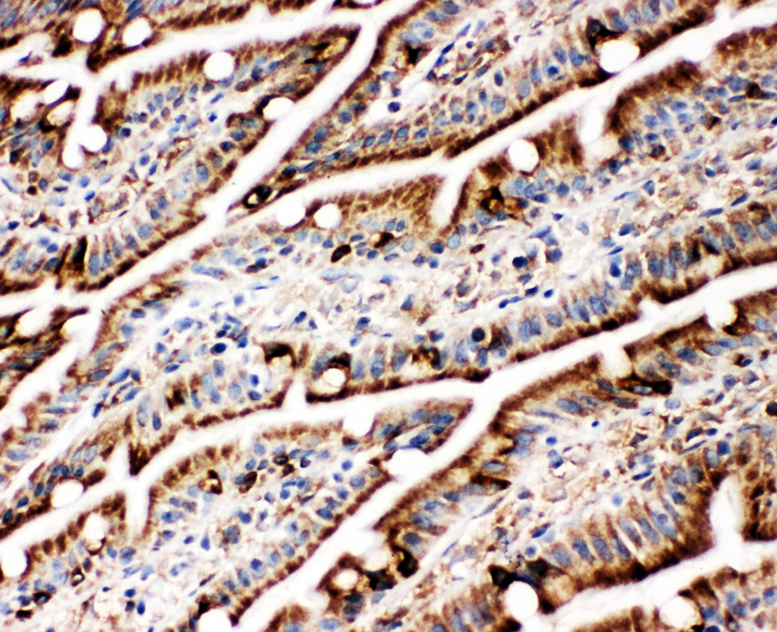 GRP78/BIP/HSPA5 was detected in frozen section of rat intestine tissue. The tissue section was incubated with rabbit anti-GRP78/BIP/HSPA5 Antibody (BA2042) at a dilution of 1:200 and developed using HRP Conjugated Rabbit IgG Super Vision Assay Kit (Catalog # SV0002) with DAB (Catalog # AR1027) as the chromogen.