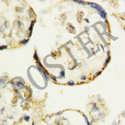 WNT3A was detected in a paraffin-embedded section of human placenta tissue. The tissue section was incubated with rabbit anti-WNT3A Antibody (BA2628-1) at a dilution of 1:200 and developed using HRP Conjugated Rabbit IgG Super Vision Assay Kit (Catalog # SV0002) with DAB (Catalog # AR1027) as the chromogen.