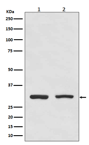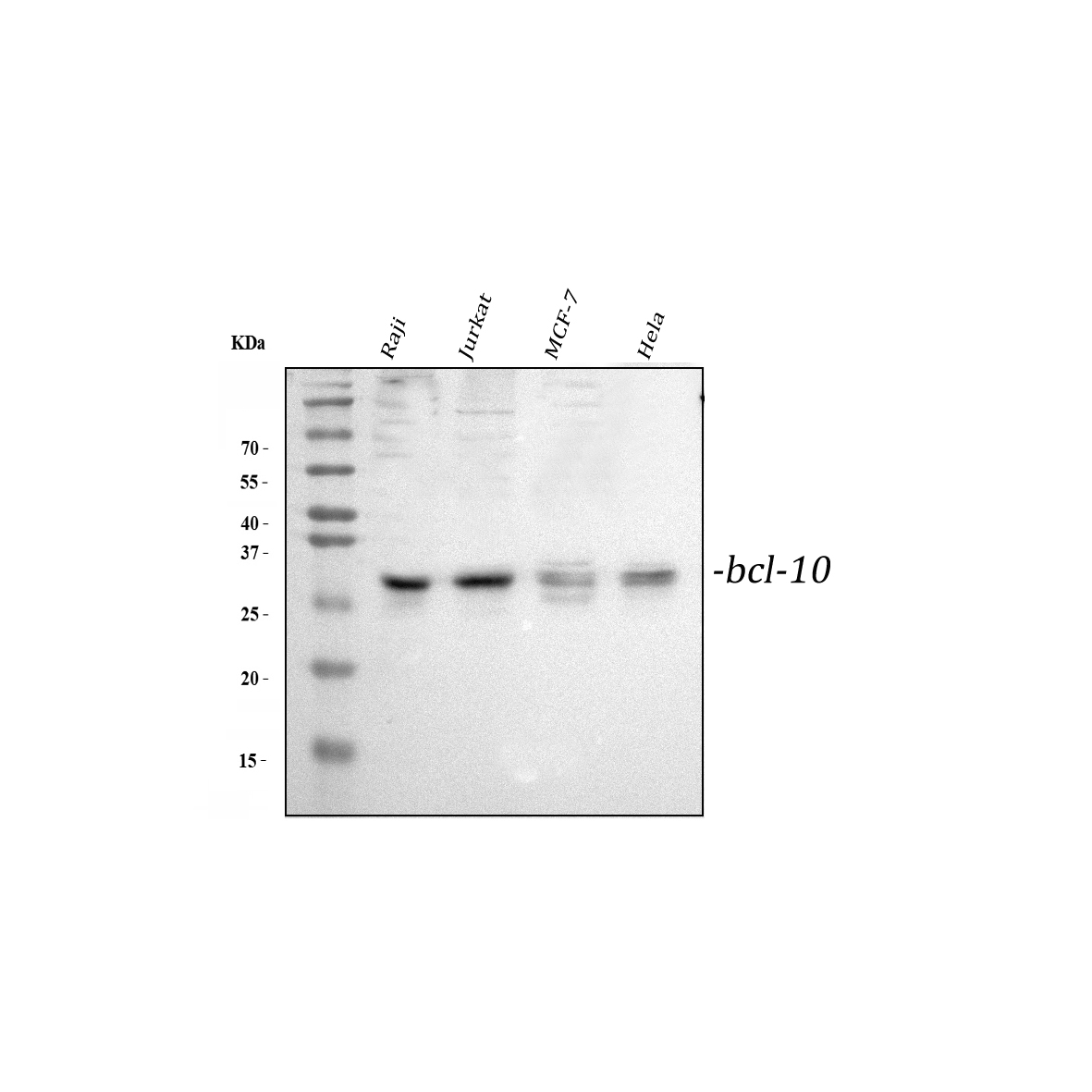 Western blot analysis of BCL10 using anti-BCL10 antibody (BA2809-2). The sample well of each lane was loaded with 30 ug of sample under reducing conditions.