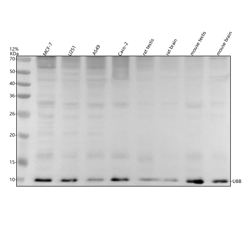 Western blot analysis of Ubiquitin/UBB using anti-Ubiquitin/UBB antibody (BA3363-2). The sample well of each lane was loaded with 30 ug of sample under reducing conditions.