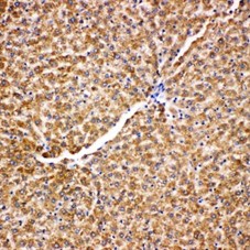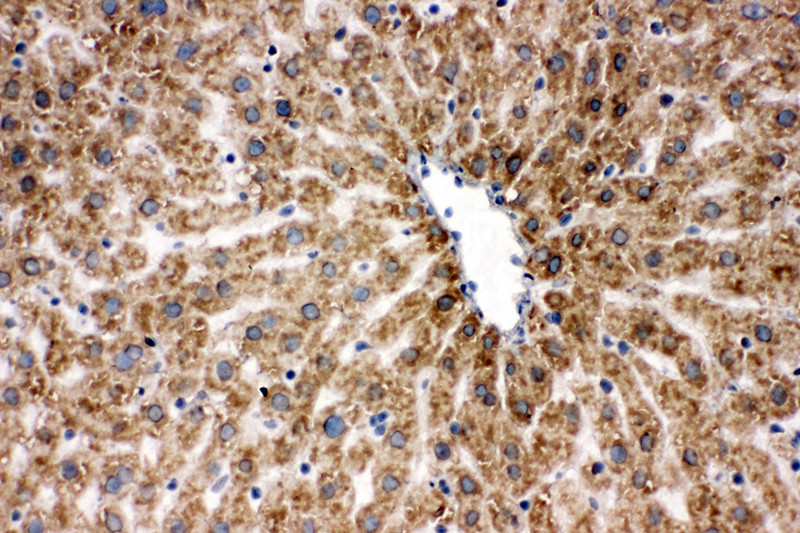 GRP75/HSPA9 was detected in frozen section of rat liver tissue. Biotinylated goat anti-rabbit IgG was used as secondary antibody. The tissue section was incubated with rabbit anti-GRP75/HSPA9 Antibody (BA3760) at a dilution of 1:200 and developed using Strepavidin-Biotin-Complex (SABC) (Catalog # SA1022) with DAB (Catalog # AR1027) as the chromogen.