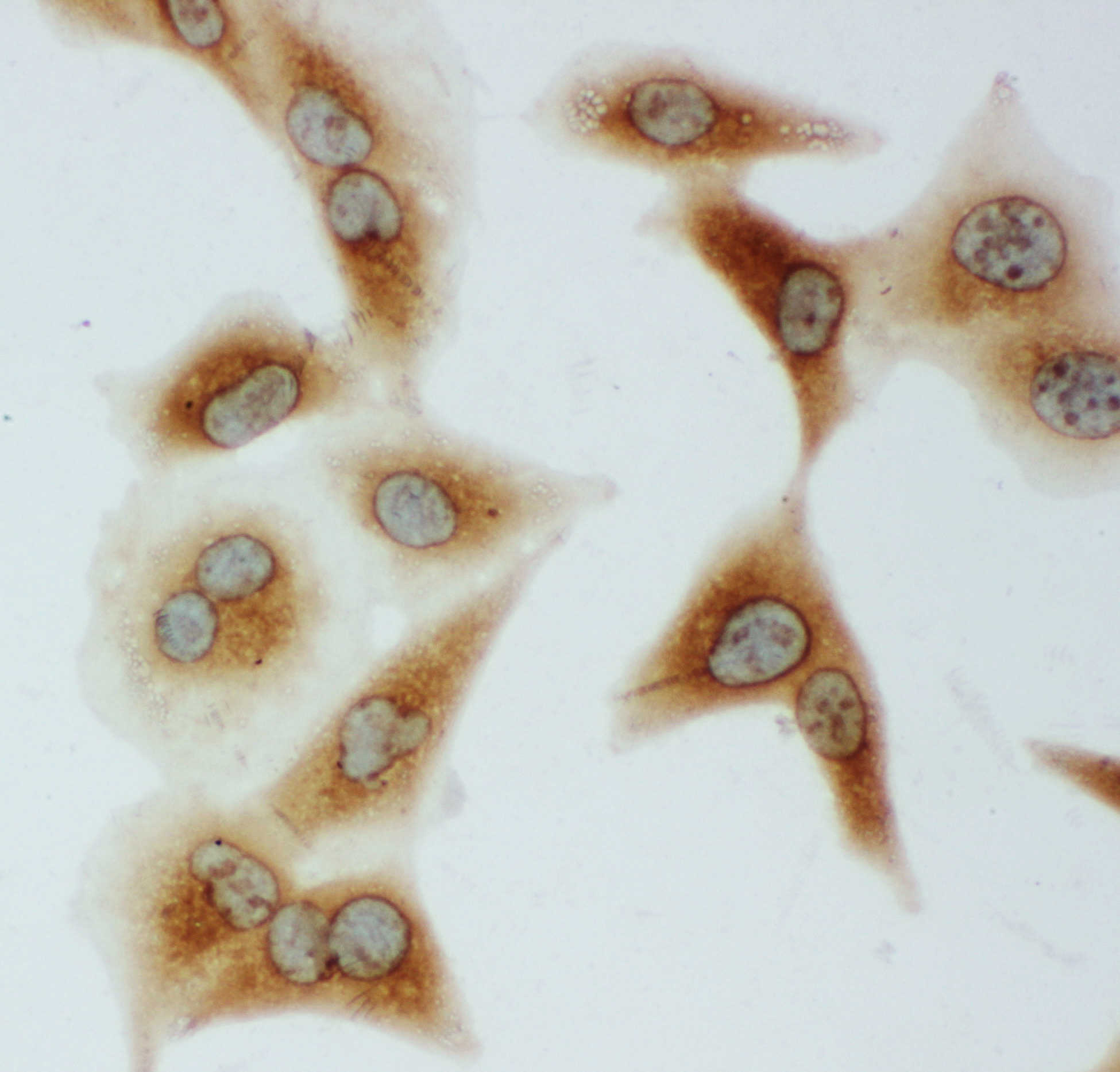 HSPA9 was detected in an immunocytochemical section of A549 cells. Biotinylated goat anti-rabbit IgG was used as secondary antibody. The section was developed using Strepavidin-Biotin-Complex (SABC)(Catalog # SA1022) with DAB (Catalog # AR1027) as the chromogen.