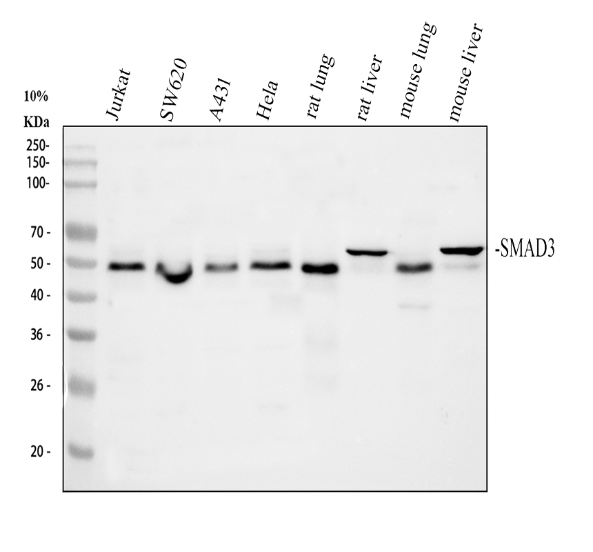 Western blot analysis of SMAD3 using anti-SMAD3 antibody (BA4559). The sample well of each lane was loaded with 30 ug of sample under reducing conditions.