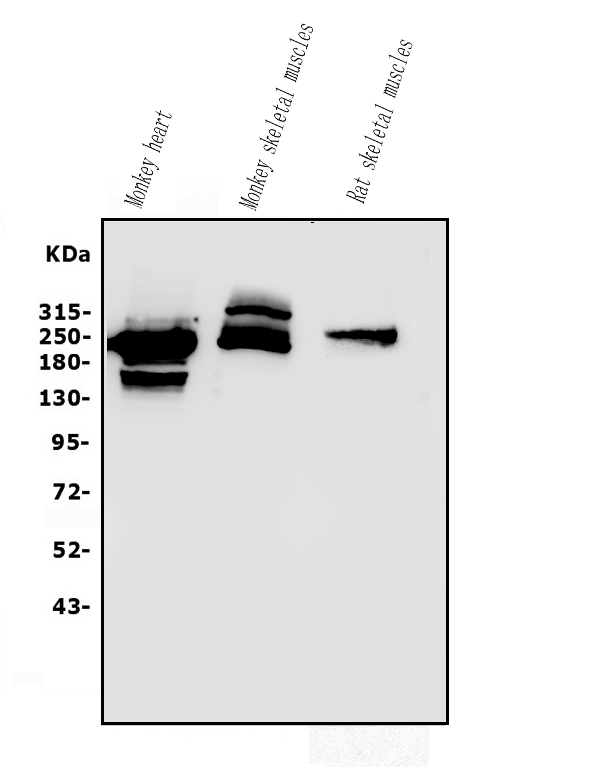Lane 3: Rat skeletal muscle tissue lysates. Use mouse anti- Myosin 1:1000, probed with a goat anti-mouse IgG-HRP secondary antibody. The signal is developed using an Enhanced Chemiluminescent detection (ECL) kit (Catalog # EK1001). A specific band was detected for Myosin at approximately 230KD. The expected band size for Myosin is at 223KD.