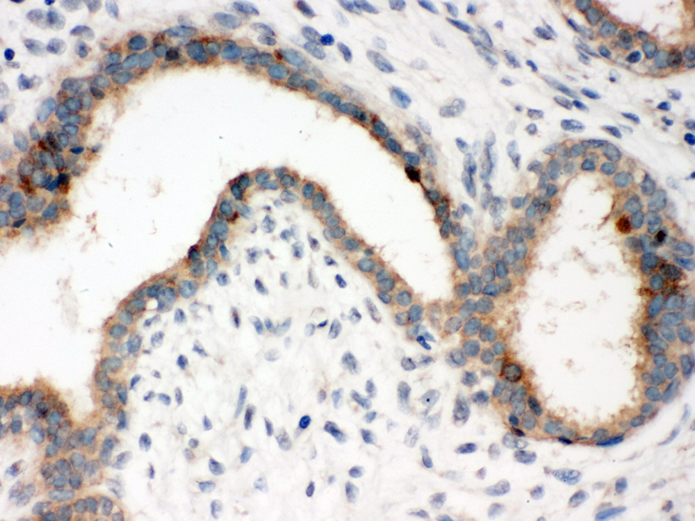| (Boiling the paraffin sections in 10mM citrate buffer,pH6.0,or PH8.0 EDTA repair liquid for 20 mins is required for the staining of formalin/paraffin sections.) Optimal working dilutions must be determined by end user. | |