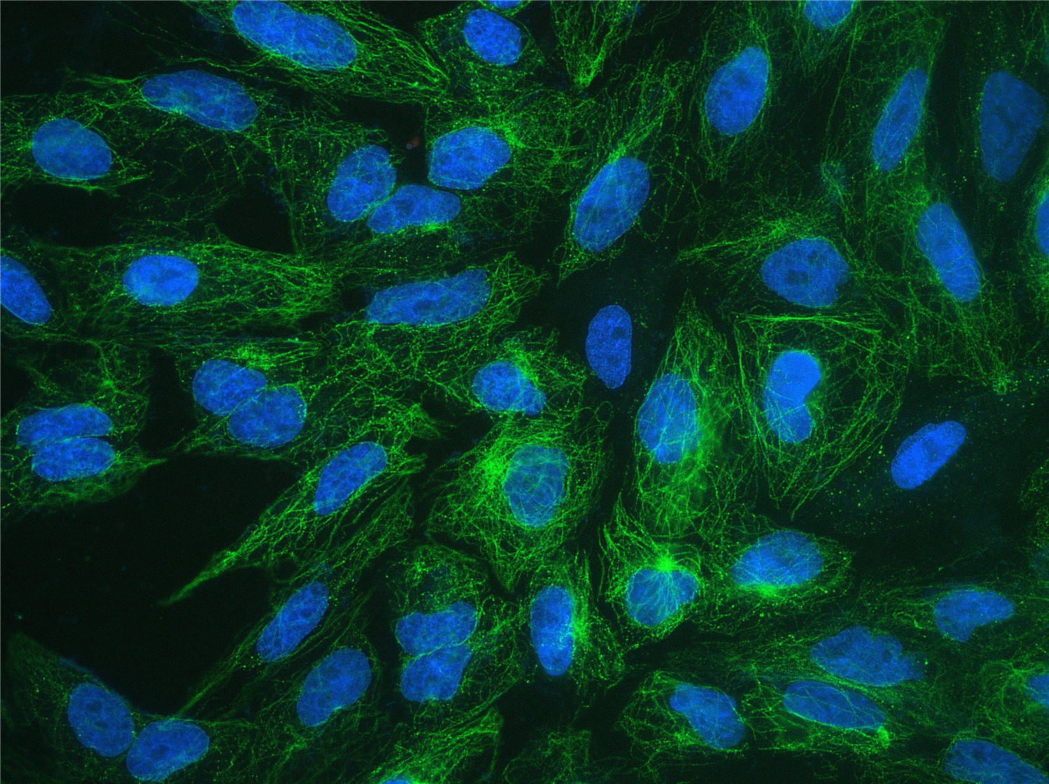 ICC analysis using anti-Beta Tubulin/TUBB antibody (BM1453) was detected in immersion fixed A549 cell line . Cells were stained using the Fluoro488-conjugated Anti-mouse IgG Secondary Antibody (green)(Catalog#BA1126) and counterstained with DAPI (blue).