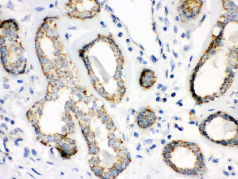 IHC analysis using Anti-BCL10 antibody (BM1565) detected in paraffin-embedded section of breast cancer tissue. Biotinylated goat anti-mouse IgG was used as secondary antibody. The tissue section was developed using Strepavidin-Biotin-Complex (SABC) (Catalog # SA1021) with DAB as the chromogen.