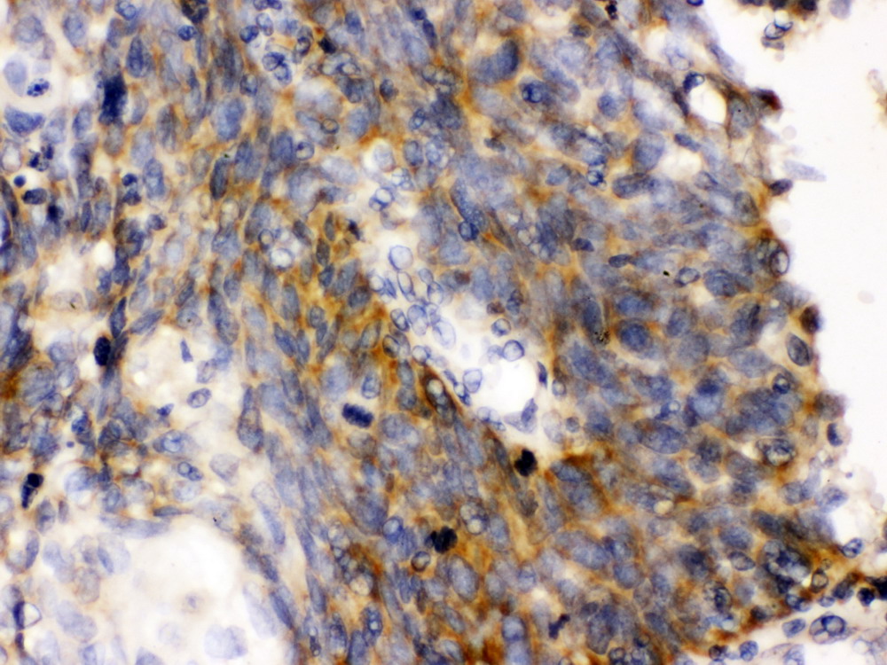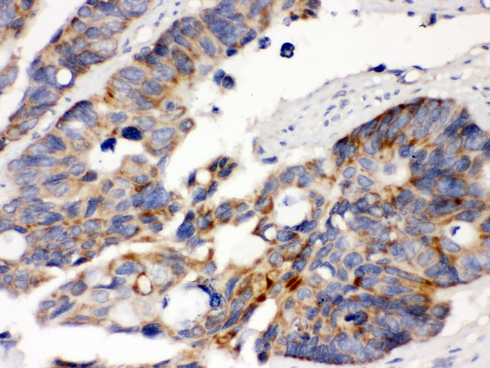IHC analysis using Anti-BCL10 antibody (BM1565) detected in paraffin-embedded section of intestinal cancer tissue. Biotinylated goat anti-mouse IgG was used as secondary antibody. The tissue section was developed using Strepavidin-Biotin-Complex (SABC) (Catalog # SA1021) with DAB as the chromogen.