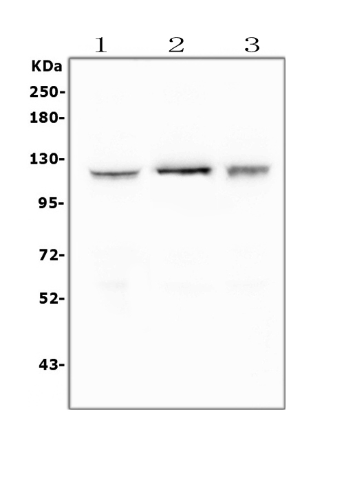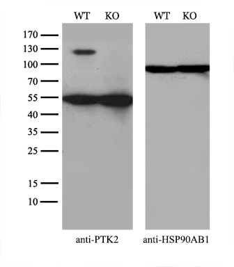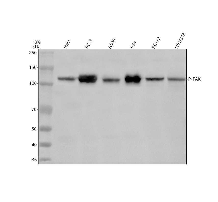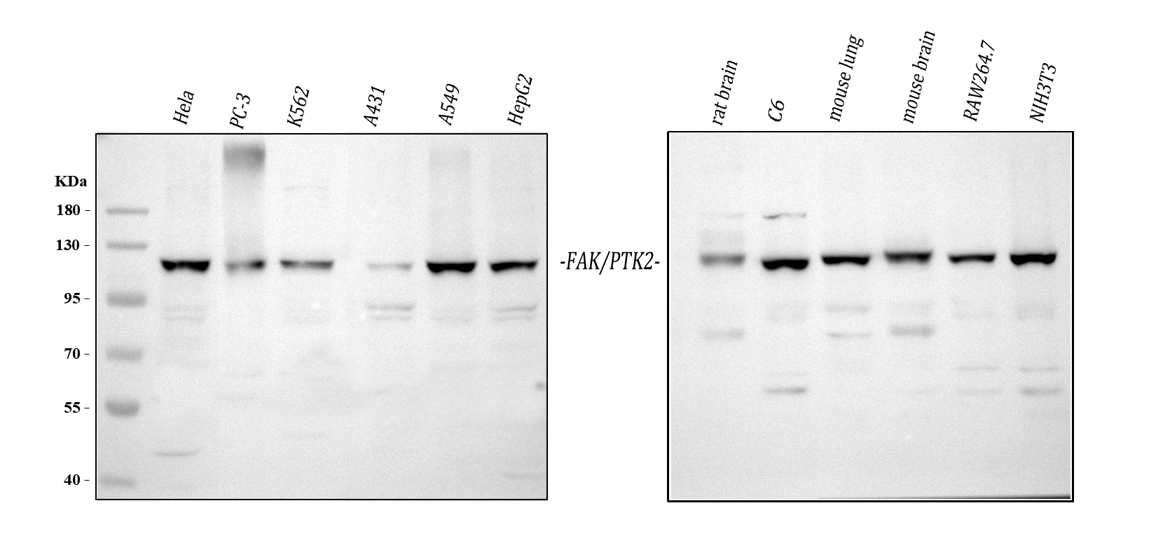 Western blot analysis of anti-FAK/PTK2 antibody (BM4303). The sample well of each lane was loaded with 30 ug of sample under reducing conditions.
