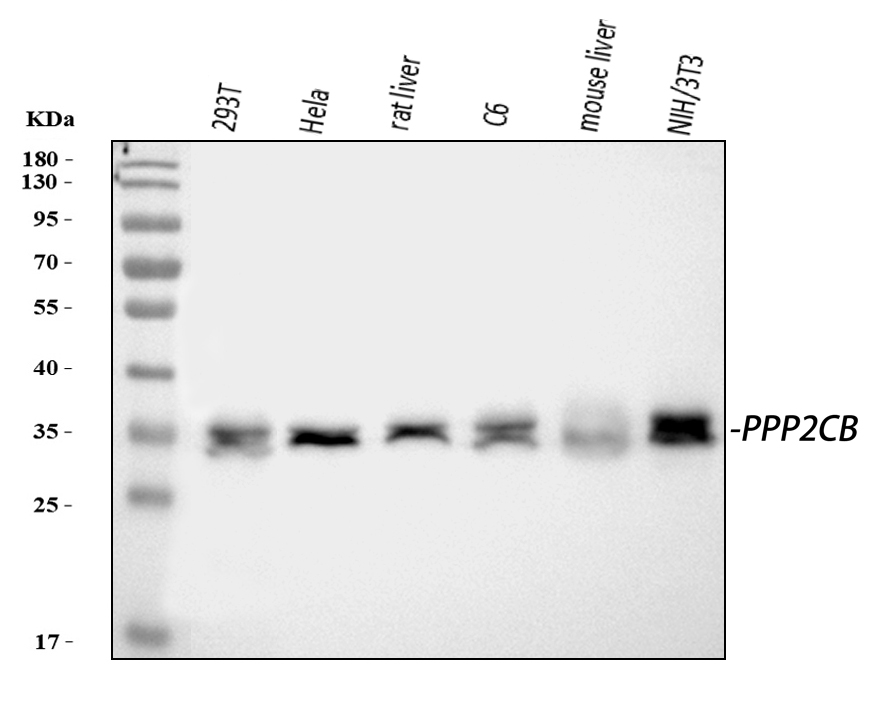 Western blot analysis of anti- PPP2CA antibody (BM4403). The sample well of each lane was loaded with 50ug of sample under reducing conditions. Lane 1: 293T whole cell, Lane 2: Hela whole cell, Lane 3: rat liver tissue, Lane 4: C6 whole cell, Lane 5: mouse liver tissue, Lane 6: NIH/3T3 whole cell. Use mouse anti- PPP2CA 1:1000, probed with a goat anti-mouse IgG-HRP secondary antibody. The signal is developed using an Enhanced Chemiluminescent detection (ECL) kit (Catalog # EK1002). A specific band was detected for PPP2CA at approximately 35KD. The expected band size for PPP2CA is at 35KD.