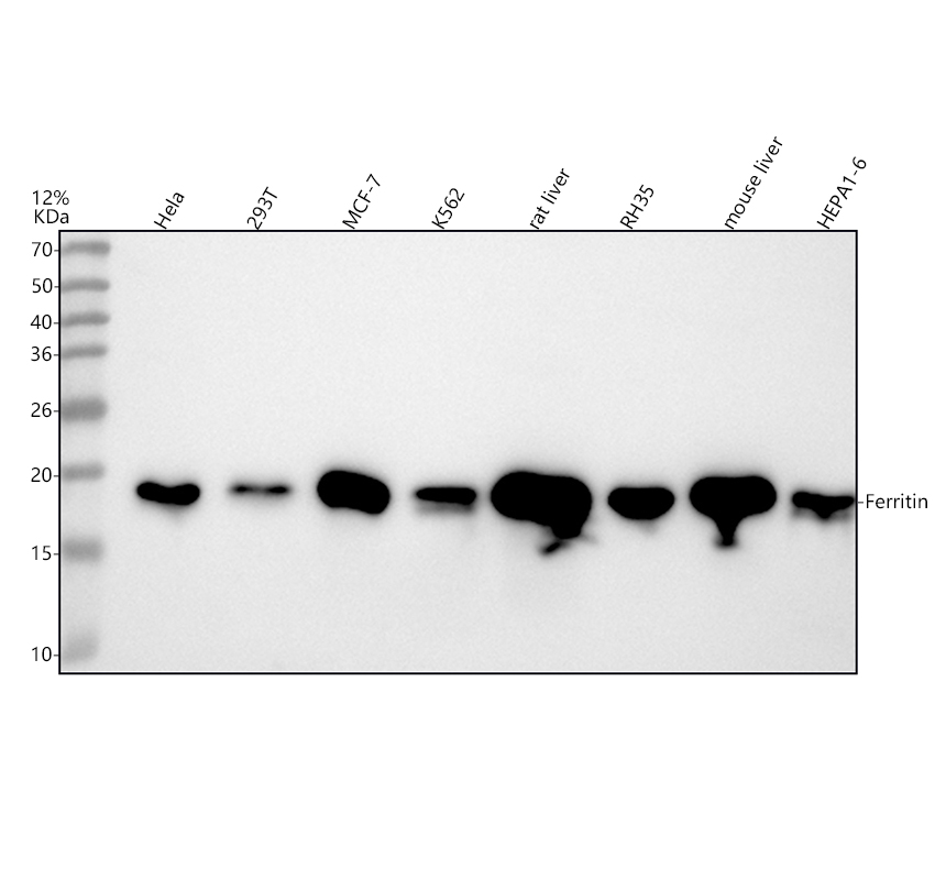 Western blot analysis of anti-Ferritin antibody (BM4487). The sample well of each lane was loaded with 30 ug of sample under reducing conditions.