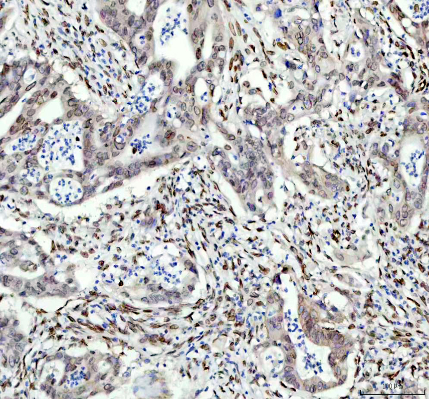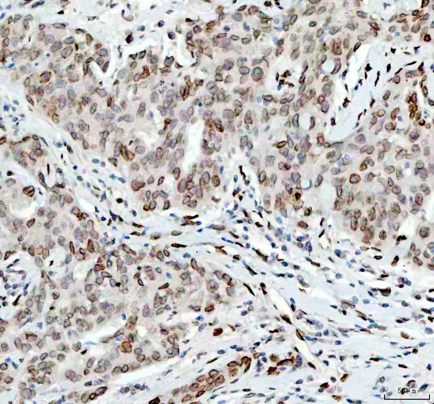 E2F1 was detected in a paraffin-embedded section of human lungcancer tissue. The tissue section was incubated with rabbit anti-E2F1 Antibody (BM4848) at a dilution of 1:200 and developed using HRP Conjugated Rabbit IgG Super Vision Assay Kit (Catalog # SV0002) with DAB (Catalog # AR1027) as the chromogen.