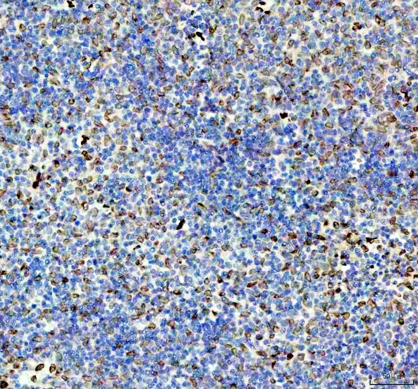 E2F1 was detected in a paraffin-embedded section of human spleen tissue. The tissue section was incubated with rabbit anti-E2F1 Antibody (BM4848) at a dilution of 1:200 and developed using HRP Conjugated Rabbit IgG Super Vision Assay Kit (Catalog # SV0002) with DAB (Catalog # AR1027) as the chromogen.