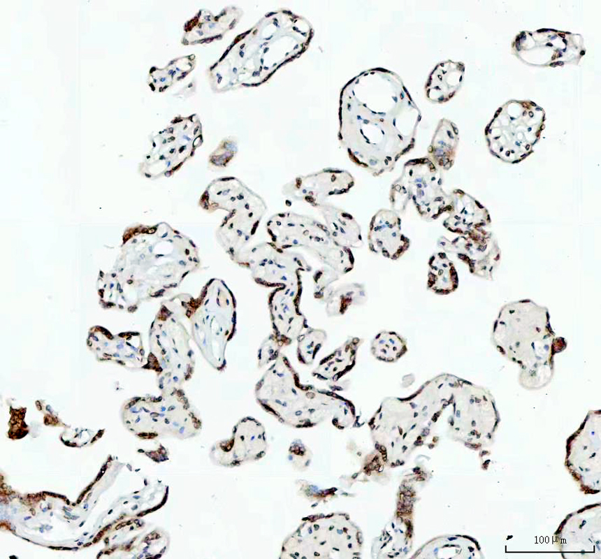E2F1 was detected in a paraffin-embedded section of human placenta tissue. The tissue section was incubated with rabbit anti-E2F1 Antibody (BM4848) at a dilution of 1:200 and developed using HRP Conjugated Rabbit IgG Super Vision Assay Kit (Catalog # SV0002) with DAB (Catalog # AR1027) as the chromogen.