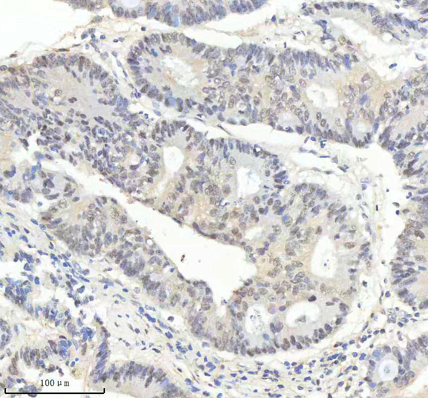 P-PRKCA was detected in a paraffin-embedded section of human colon cancer tissue. The tissue section was incubated with rabbit anti-P-PRKCA Antibody (BM4896) at a dilution of 1:200 and developed using HRP Conjugated Rabbit IgG Super Vision Assay Kit (Catalog # SV0002) with DAB (Catalog # AR1027) as the chromogen.
