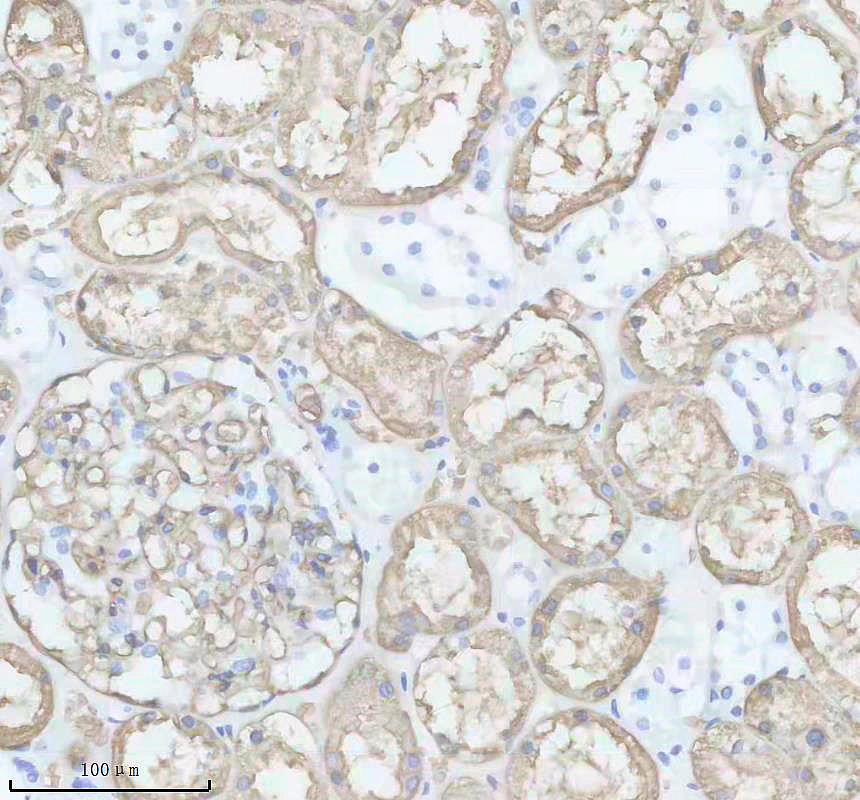 AQP1 was detected in a paraffin-embedded section of human kidney tissue. The tissue section was incubated with rabbit anti-AQP1 Antibody (BM5035) at a dilution of 1:200 and developed using HRP Conjugated Rabbit IgG Super Vision Assay Kit (Catalog # SV0002) with DAB (Catalog # AR1027) as the chromogen.
