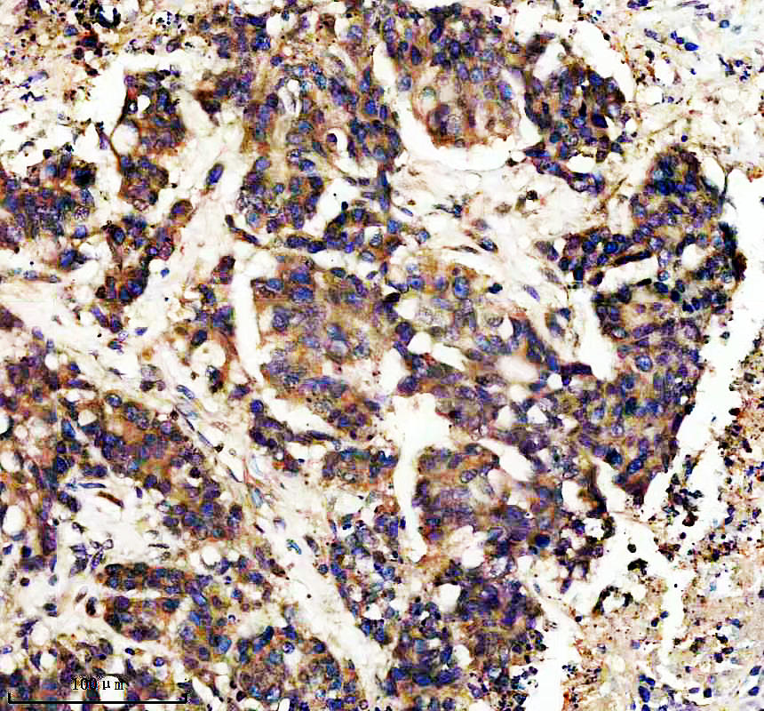 CAMK2A was detected in a paraffin-embedded section of human colon cancer tissue. The tissue section was incubated with rabbit anti-CAMK2A Antibody (BM5046) at a dilution of 1:200 and developed using HRP Conjugated Rabbit IgG Super Vision Assay Kit (Catalog # SV0002) with DAB (Catalog # AR1027) as the chromogen.