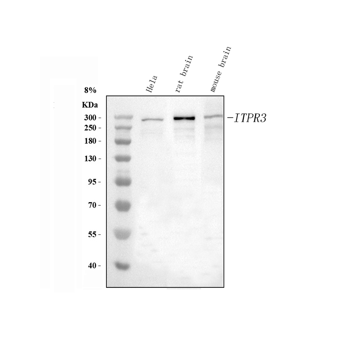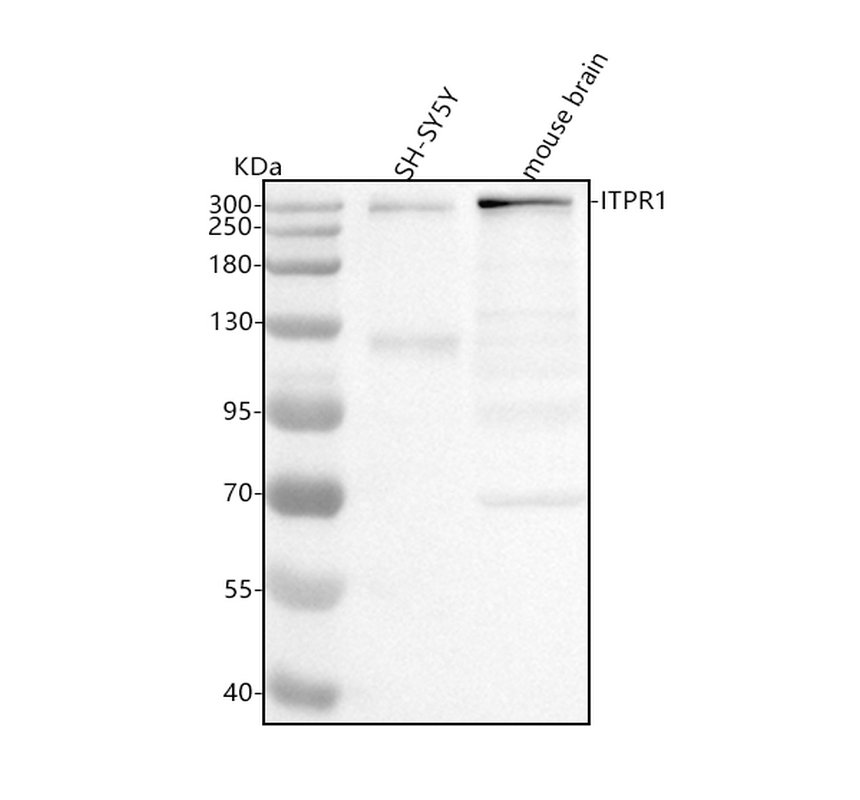 After electrophoresis, proteins were transferred to a membrane. Then the membrane was incubated with rabbit anti-ITPR1 antigen affinity purified monoclonal antibody (BM5235) at a dilution of 1:1000 and probed with a goat anti-rabbit IgG-HRP secondary antibody (Catalog # BA1054). The signal is developed using ECL Plus Western Blotting Substrate (Catalog # AR1197). A specific band was detected for ITPR1 at approximately 314 kDa. The expected band size for ITPR1 is at 314 kDa.