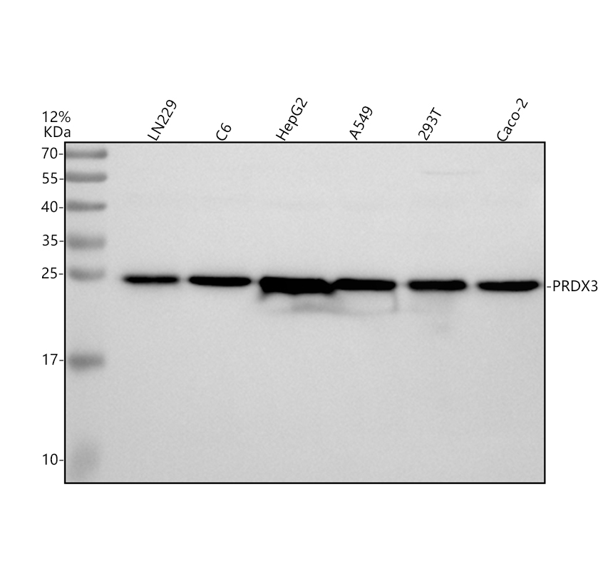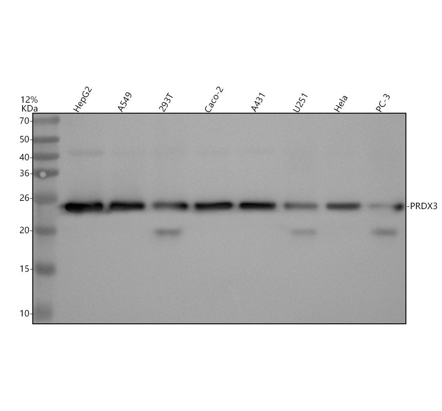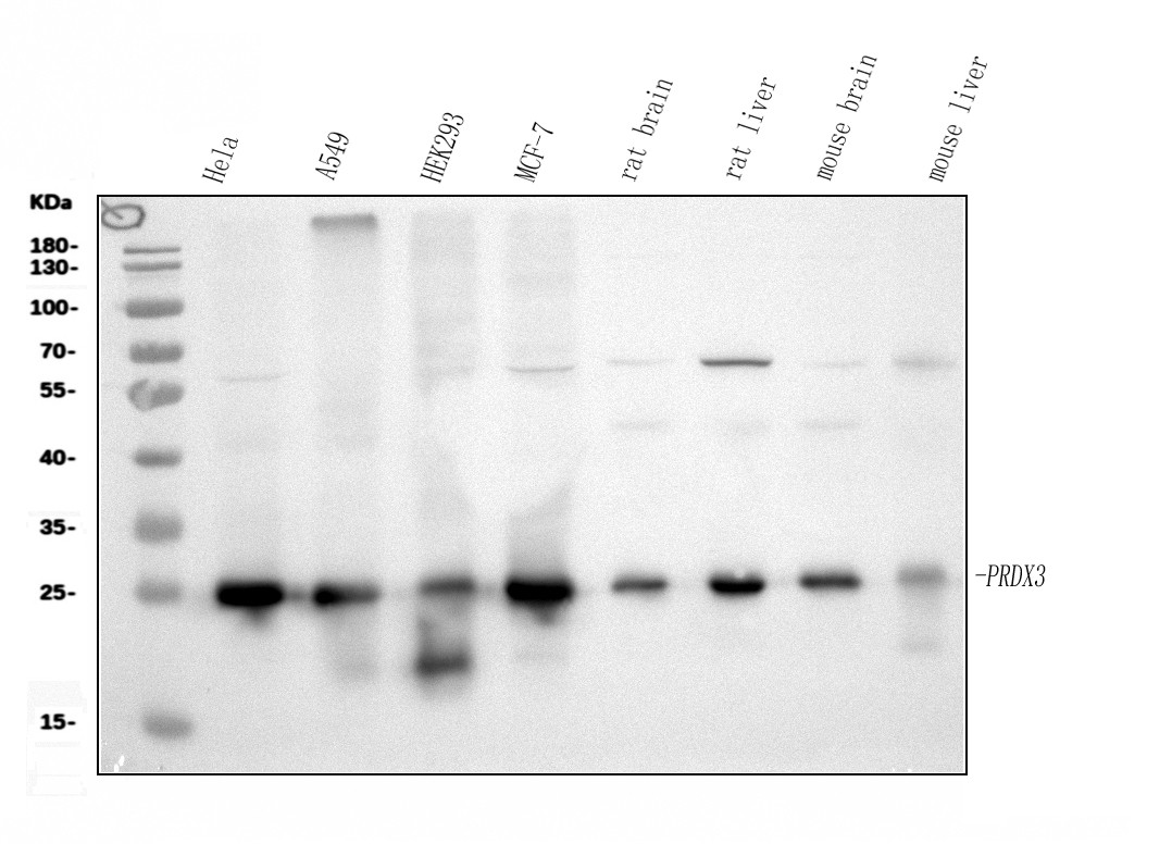 Western blot analysis of anti-PRDX3 antibody (BM5274). The sample well of each lane was loaded with 30 ug of sample under reducing conditions.