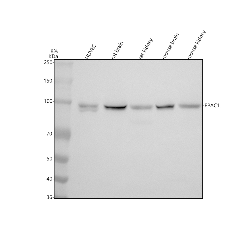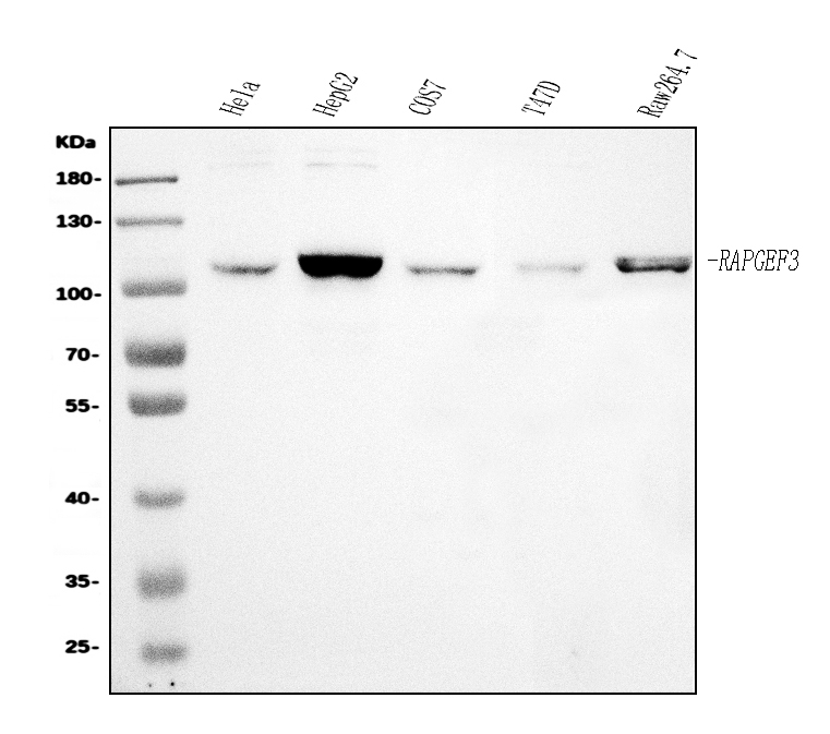 Western blot analysis of anti-EPAC1/RAPGEF3 antibody (BM5482). The sample well of each lane was loaded with 30 ug of sample under reducing conditions.