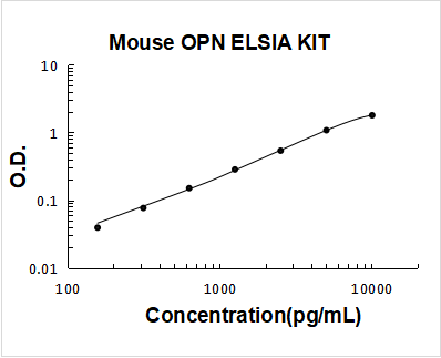 Osteopontin (OPN) also called urinary stone protein, secreted phosphoprotein 1 (SPP1), bone sialoprotein, and early T lymphocyte activation 1 (ETA1). Osteopontin is a phosphorylated glycoprotein secreted to the mineralizing extrOPNllular matrix by osteoblasts during bone development. It is believed to facilitate the attachment of osteoblasts and osteoclasts to the extrOPNllular matrix, allowing them to perform their respective functions during osteogenesis. Osteopontin is presumably involved in stone formation as stone matrix. The deduced protein sequence reveals a 317-amino acid protein (34,982 Da) containing a 16-amino acid hydrophobic signal sequence and a 33,352-Da protein destines to undergo extensive post-translational modifications before being secreted from the cell. The gene is located on human chromosome 4. The standard product used in this kit is recombinant mouse OPN, consisting of 284 amino acid sequence with the molecular mass of 31.5KDa. As a result of glycosylation, the molecular mass is 65KDa.