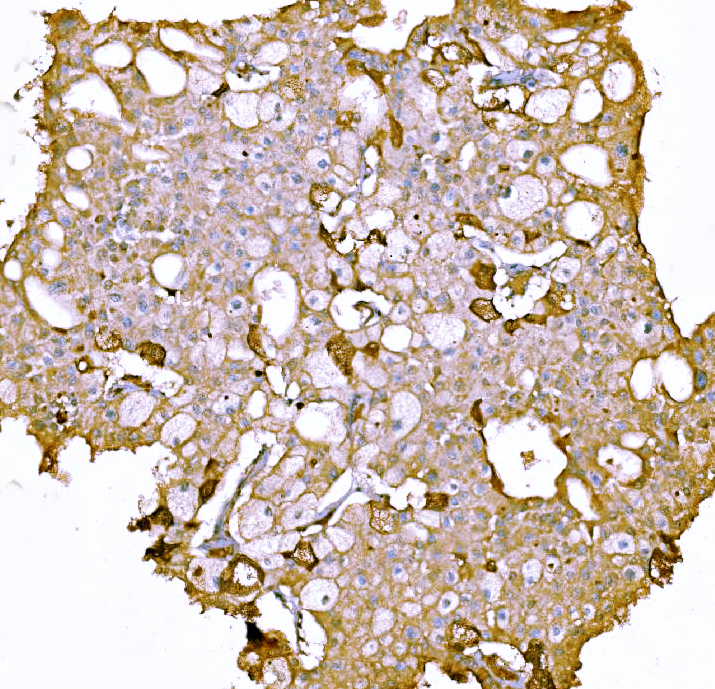 F2 was detected in a paraffin-embedded section of human liver cancer tissue. Biotinylated goat anti-mouse IgG was used as secondary antibody. The tissue section was incubated with mouse anti-F2 Antibody (M00044-2) at a dilution of 1:200 and developed using Strepavidin-Biotin-Complex (SABC) (Catalog # SA1021) with DAB (Catalog # AR1027) as the chromogen.