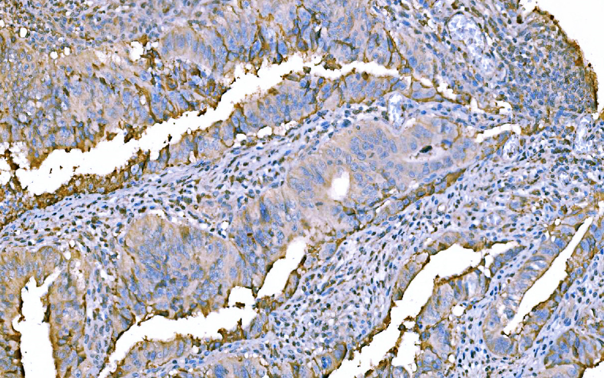 F2 was detected in a paraffin-embedded section of human Colorectal cancer tissue. Biotinylated goat anti-mouse IgG was used as secondary antibody. The tissue section was incubated with mouse anti-F2 Antibody (M00044-2) at a dilution of 1:200 and developed using Strepavidin-Biotin-Complex (SABC) (Catalog # SA1021) with DAB (Catalog # AR1027) as the chromogen.