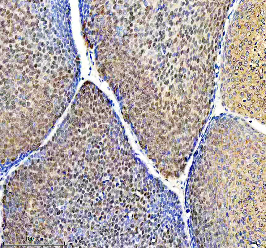 TP63 was detected in a paraffin-embedded section of mouse thymus tissue. The tissue section was incubated with mouse anti-TP63 Antibody (M00167-3) at a dilution of 1:200 and developed using HRP Conjugated Mouse IgG Super Vision Assay Kit (Catalog # SV0001) with DAB (Catalog # AR1027) as the chromogen.