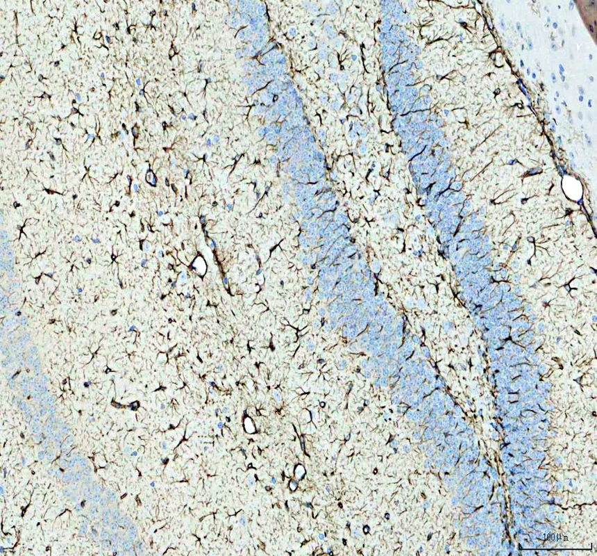 GFAP was detected in a paraffin-embedded section of mouse Hippocampus tissue. Biotinylated goat anti-mouse IgG was used as secondary antibody. The tissue section was incubated with mouse anti-GFAP Antibody (M00213-8) at a dilution of 1:200 and developed using Strepavidin-Biotin-Complex (SABC) (Catalog # SA1021) with DAB (Catalog # AR1027) as the chromogen.
