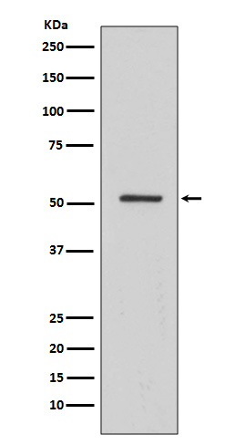 After electrophoresis, proteins were transferred to a membrane. Then the membrane was incubated with rabbit anti-HNF4A antigen affinity purified monoclonal antibody (M00389-4) at a dilution of 1:1000 and probed with a goat anti-rabbit IgG-HRP secondary antibody (Catalog # BA1054). The signal is developed using ECL Plus Western Blotting Substrate (Catalog # AR1197). A specific band was detected for HNF4A at approximately 53 kDa. The expected band size for HNF4A is at 53 kDa.