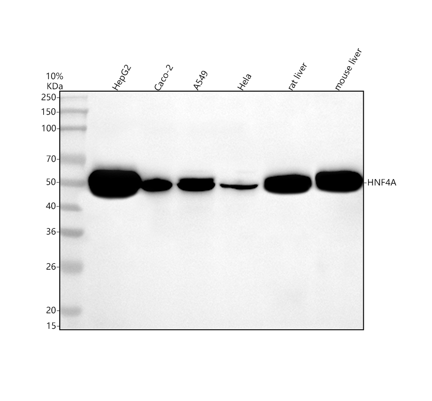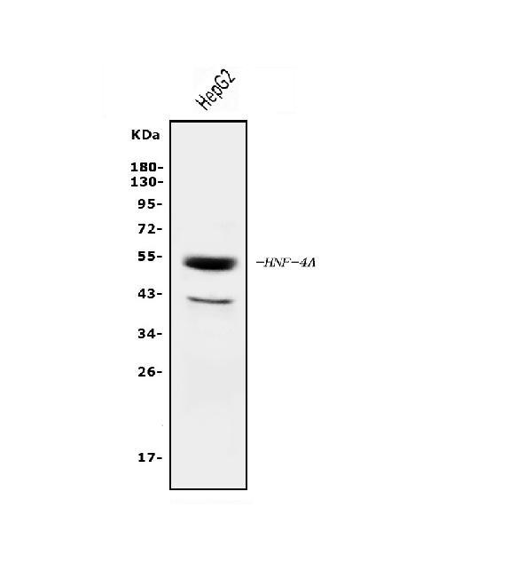 Western blot analysis of anti-HNF4A antibody (M00389-4). The sample well of each lane was loaded with 30 ug of sample under reducing conditions.