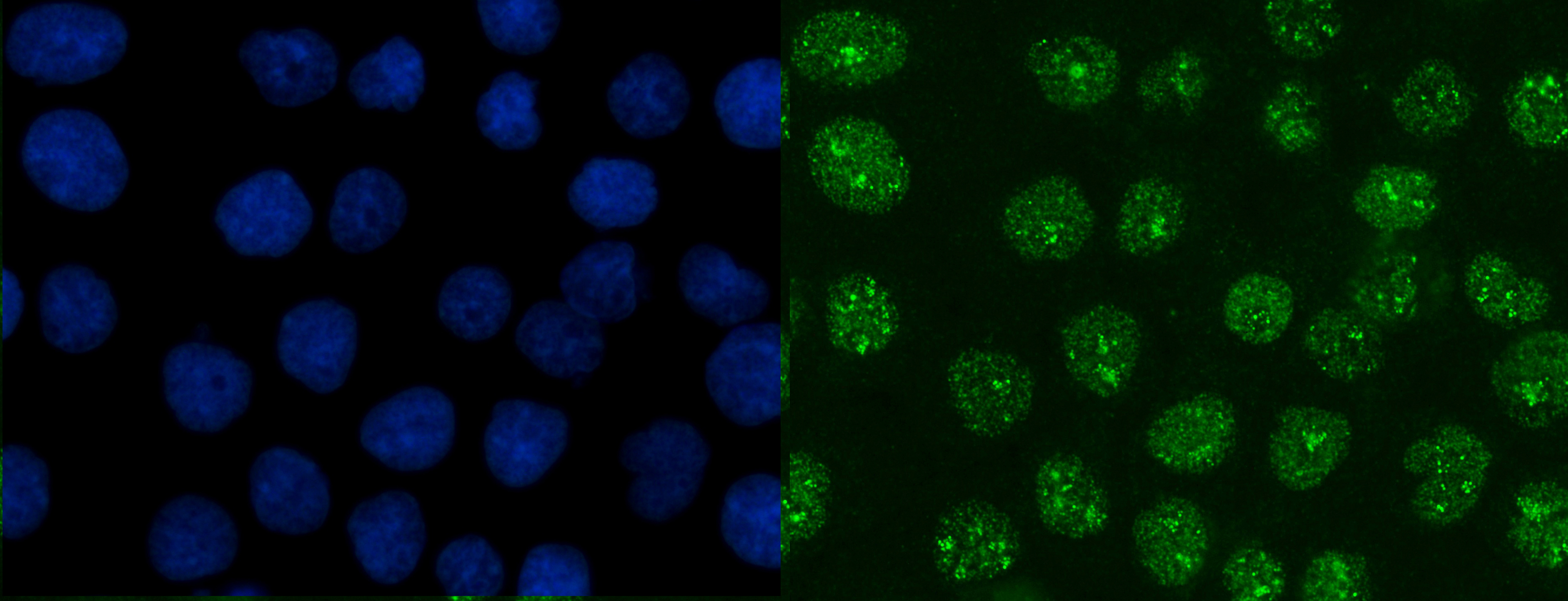 XRCC1 was detected in an immunocytochemical section of A431 cells. The section was incubated with mouse anti-XRCC1 Antibody (M00571-2) at a dilution of 1:100. Fluoro488-conjugated Anti-mouse IgG Secondary Antibody (green)(Catalog#BA1126) was used as secondary antibody. The section was counterstained with DAPI (Catalog # AR1176) (Blue).